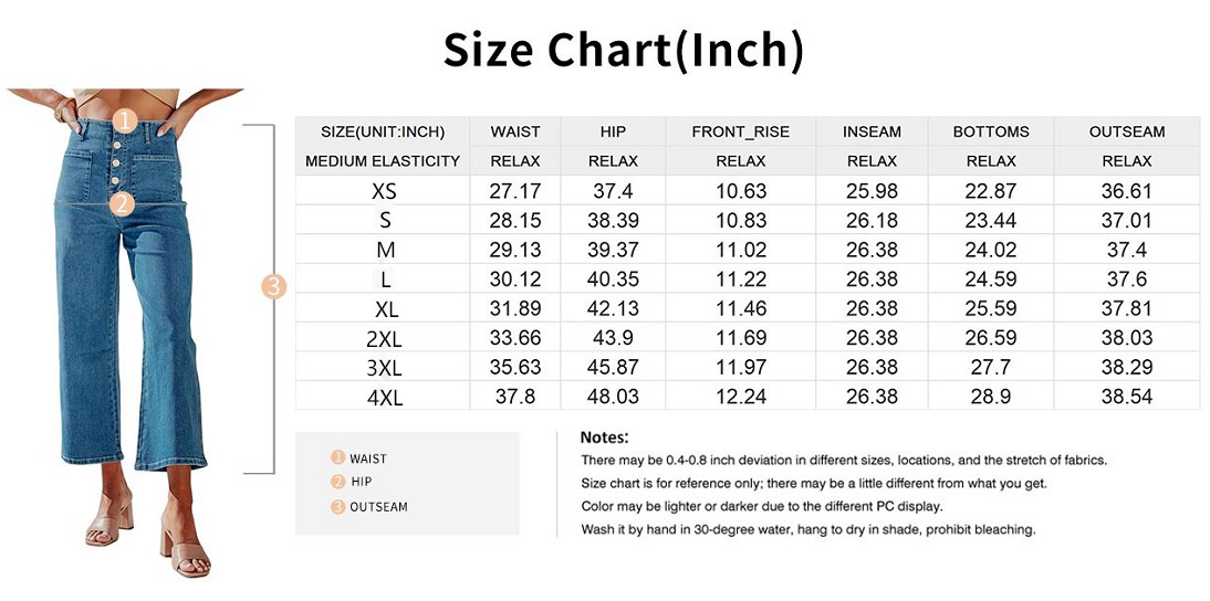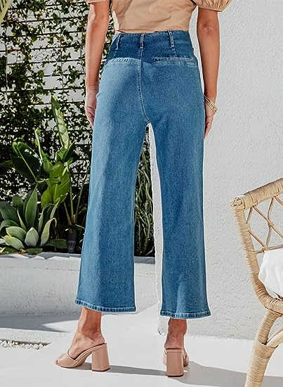 The unique design of wide-leg jeans: High waisted breasted jean makes your waist smaller, and loose, straight legged pants make you more comfortable.