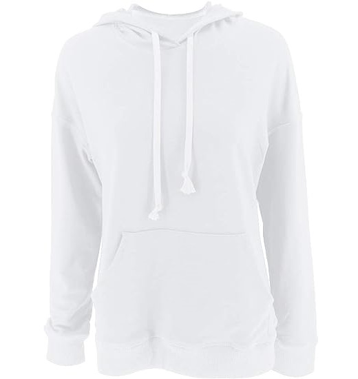 Features: rounded neckline with hood detail, long sleeves,cloose fitting pullover with pocket.