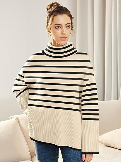 ?FEATURES - This is the oversized sweater you’ve been waiting for. The special stripes and split hem design make it a perfect reflection of your fashion taste. This pullover jumper with a turtleneck fit is a long-lasting item that will swiftly become a wardrobe staple.
